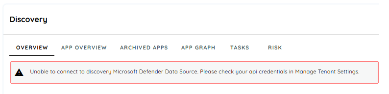 In case AppNavi runs into connectivity issues with Defender Api, it will display an error message in AppNavi Portal. Which will be useful for Tenant Owner to diagnose the issue and fix it.