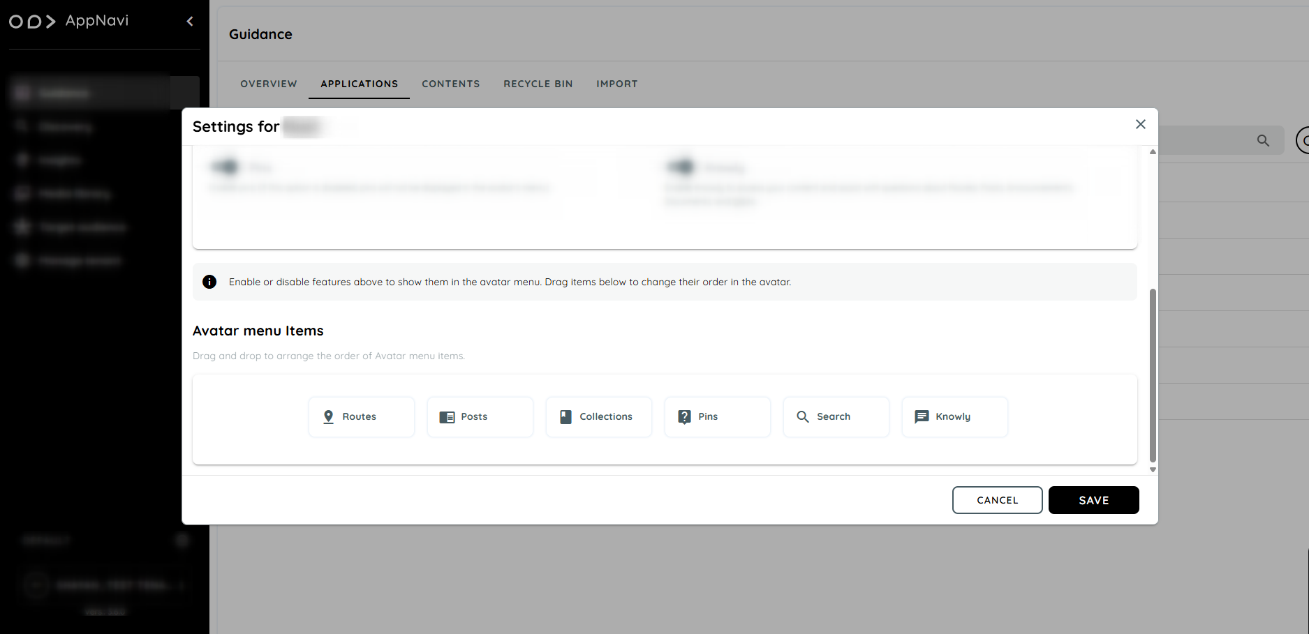 Avatar Menu Customization provides control over the menu layout in the Avatar. It ensures that the most relevant contents are displayed first, improves navigation, and allows administrators to adjust the interface easily through a drag-and-drop interface in the Application Settings.