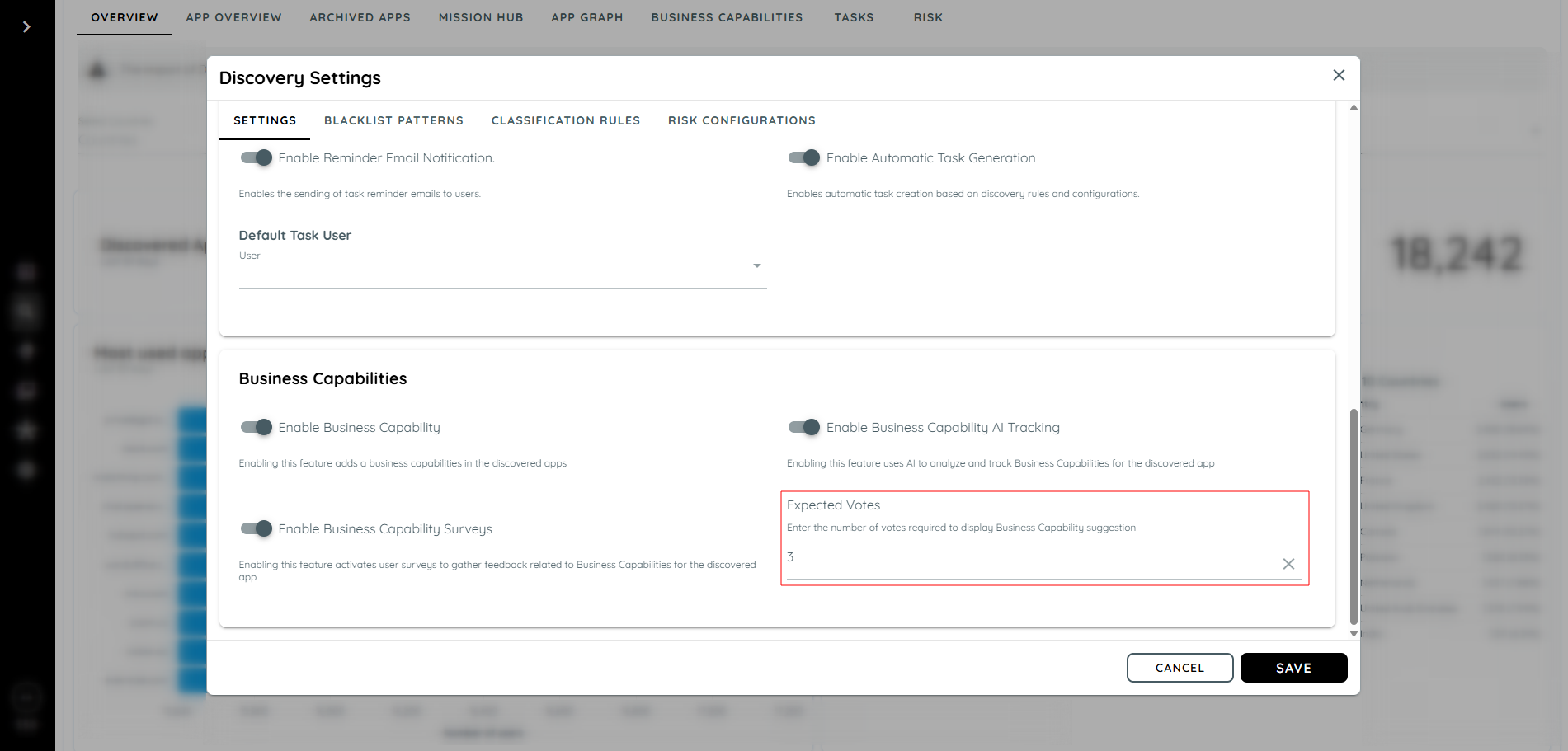 When users participate in the BC Survey and the number of votes for a specific business capability meets or exceeds this threshold, a BC Suggestion will automatically appear for the corresponding Discovered Application.