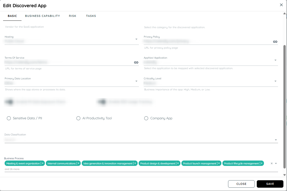 This feature applies to all discovered applications within the organization. Each application can have one assigned business process from a predefined, multilingual list (English and German).