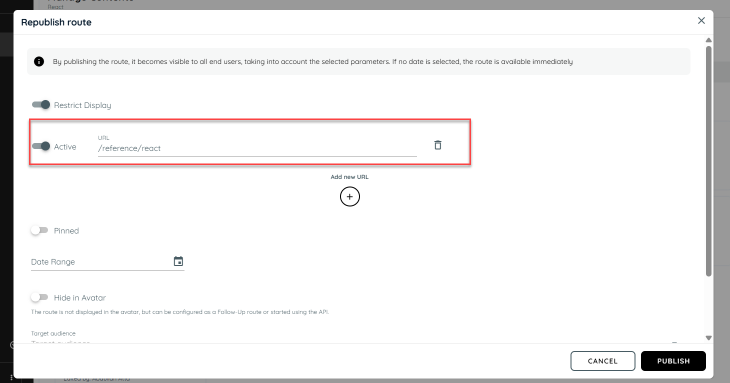 When publishing a route in AppNavi, you can restrict its display by adding a specific URL pattern. This ensures that the route is only visible on designated pages of application and hidden elsewhere.