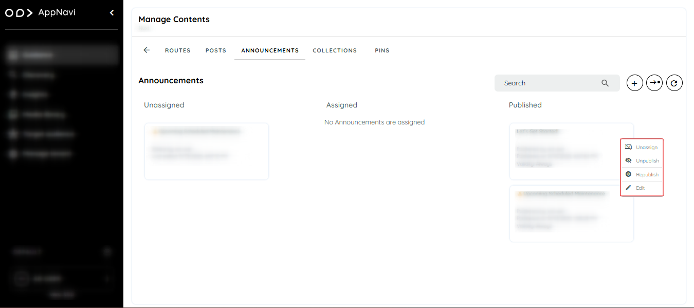 - Publish, unpublish, or republish a specific Route, Post, Collection, Announcement or Pin within a single application.