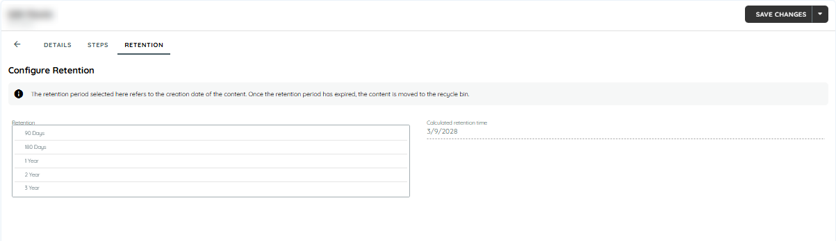 The users can also change the retention period of any content by selecting the standard retention's from the drop down. Once the user saves the retention, from the current day till its retention time the content will exist on the assigned application and then get deleted and move to the recycle bin only if it is assigned or unassigned in that period of time. The content will not be deleted if it is still published even if the retention period has been met.