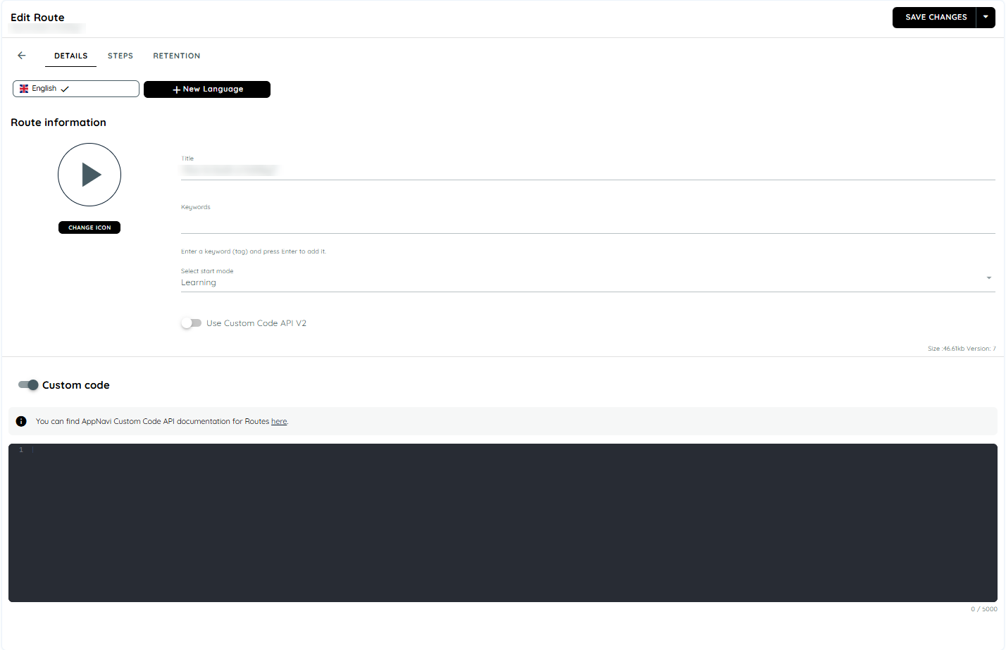 Appnavi supports custom code on the route level also. The code can be executed within the context of the corresponding route initiated and can register for events such as "routeStart", "routeStop", and "playStep , etc". For more details on custom code events refer to the Custom code. However, the custom code feature is only available if it has been enabled at the tenant, application, and route levels. Users with portal access can modify and save custom code for their applications. The maximum size of the custom code should not exceed 5000 characters.