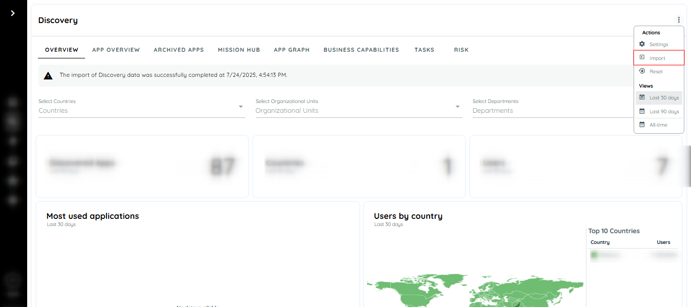 As a Tenant Owner, you can now import Demo Data for Discovery in your tenant to explore and understand how Discovery dashboards and analytics work before any real user data is available. This helps you visualize event trends, business capabilities, and usage patterns using meaningful sample data.
