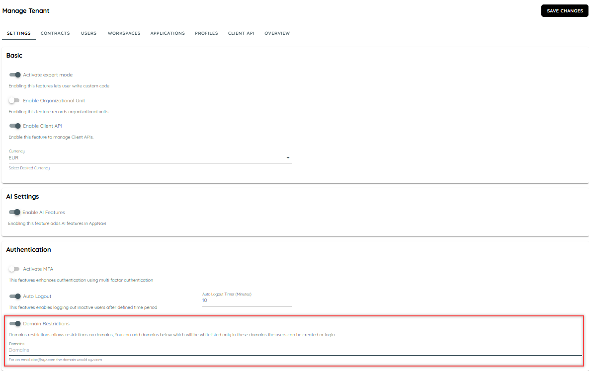 Domain restriction can be configured within the 'Manage Tenant' settings. By default, it is disabled. After enabling this feature, users can specify the desired domains, with a limit of 10 domains at a time. Once the domains are specified, new users with email addresses matching the specified domains can be created.