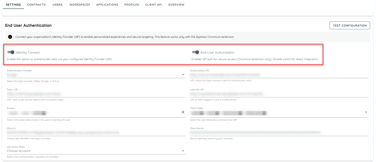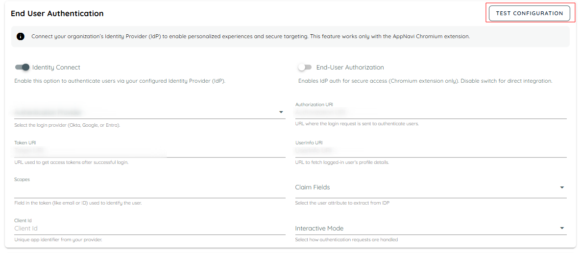 - Click “Test Configuration” in the Identity Connect Settings section.