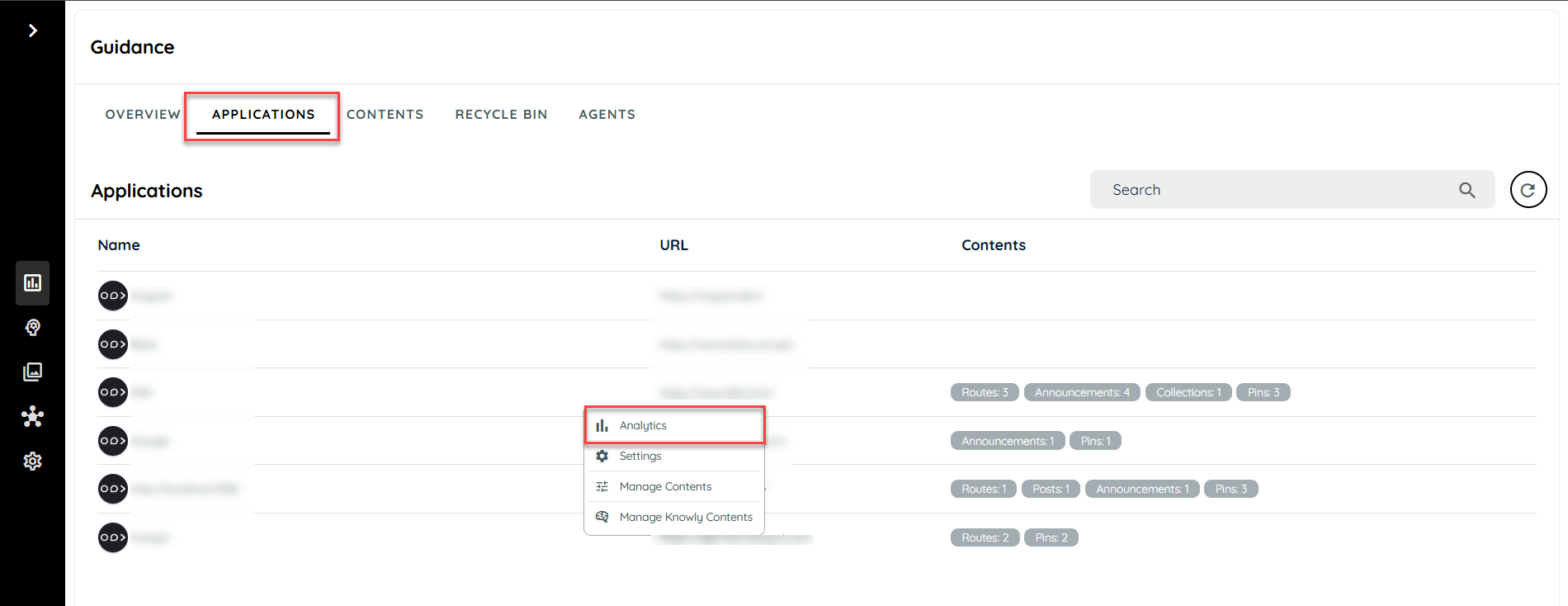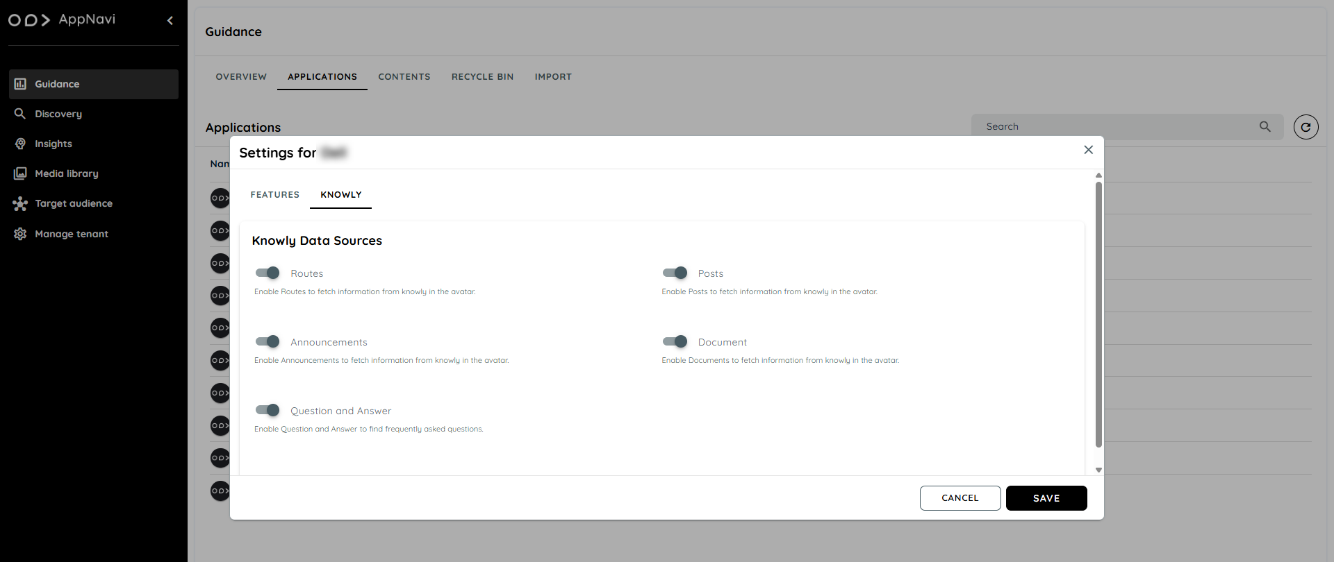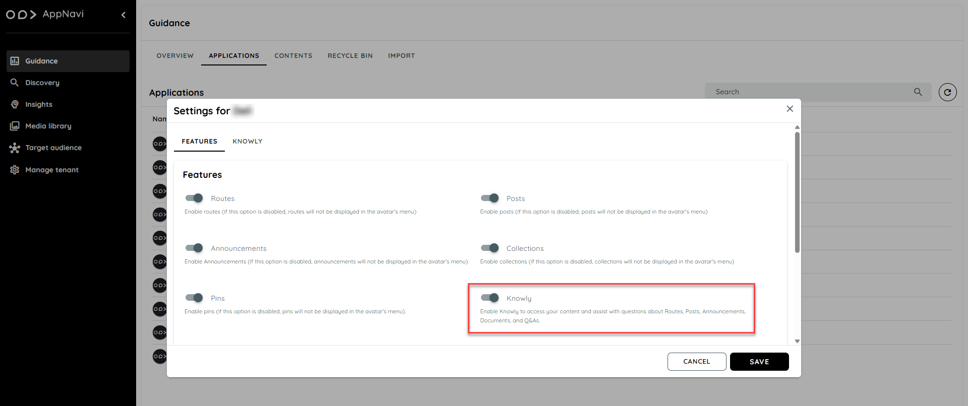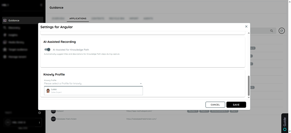 The knowly feature is available in the guidance module. This feature can be managed from the application listing tab in Guidance. User can open the settings from the context menu of the desired application. On a fresh application the knowly feature will be enabled from default.