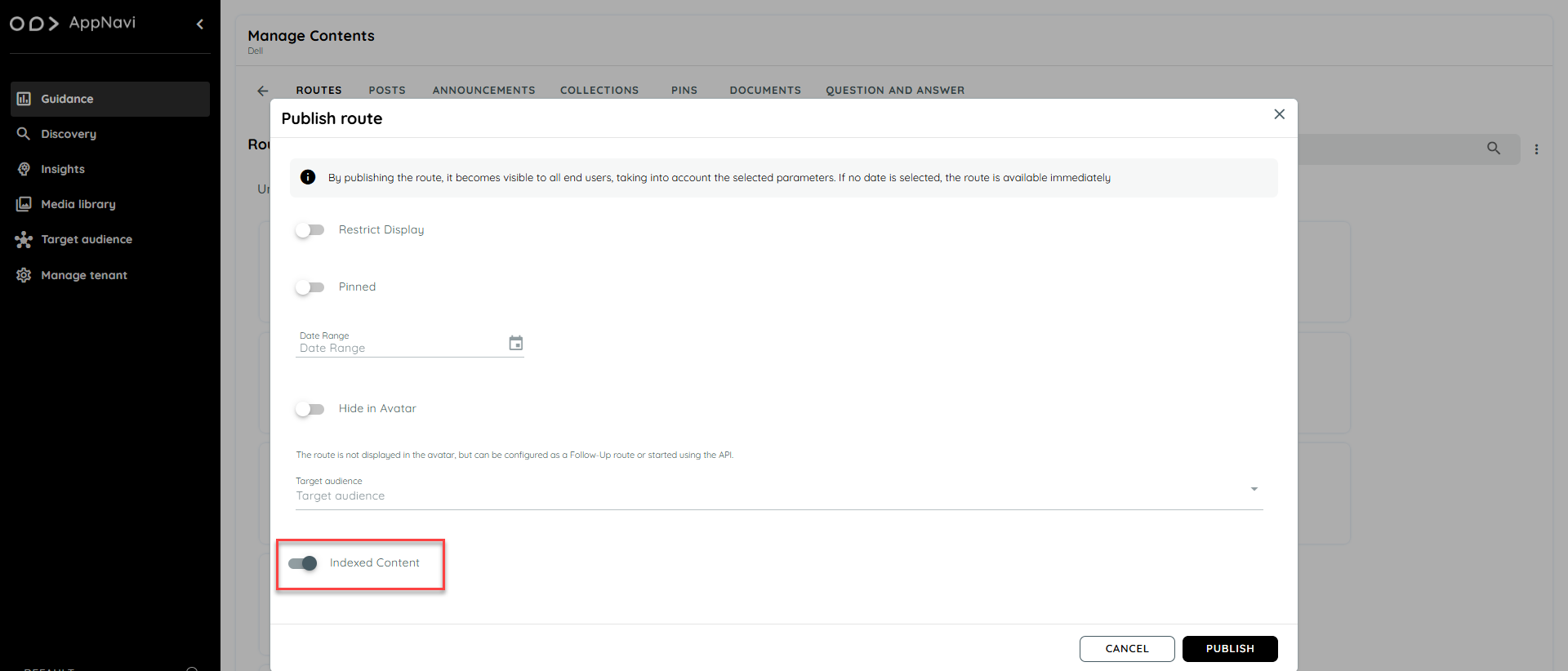 On publishing any content like Routes, Posts and Announcements, a toggle for indexed content will be marked as enabled when the content will be published. On disabling this toggle the published content will not be marked as indexed content and will not be available in the knowly feature on the Avatar chat.