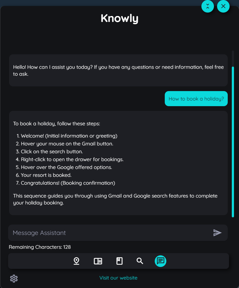 Suppose if there is any type of information regarding any content which has information of "How to book a holiday?" then the chat will return the users all type of information stored in a structured manner.