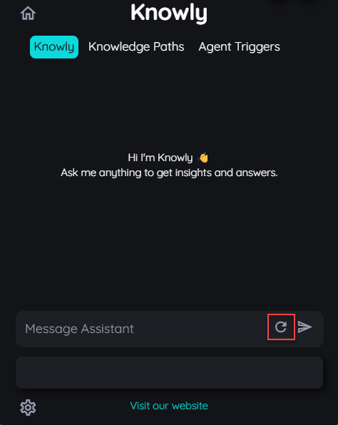 Users can start a fresh chat with Knowly related to any other information using the reload chat button. Once the reload button is used a fresh conversation will be started with no reference of the old chat.