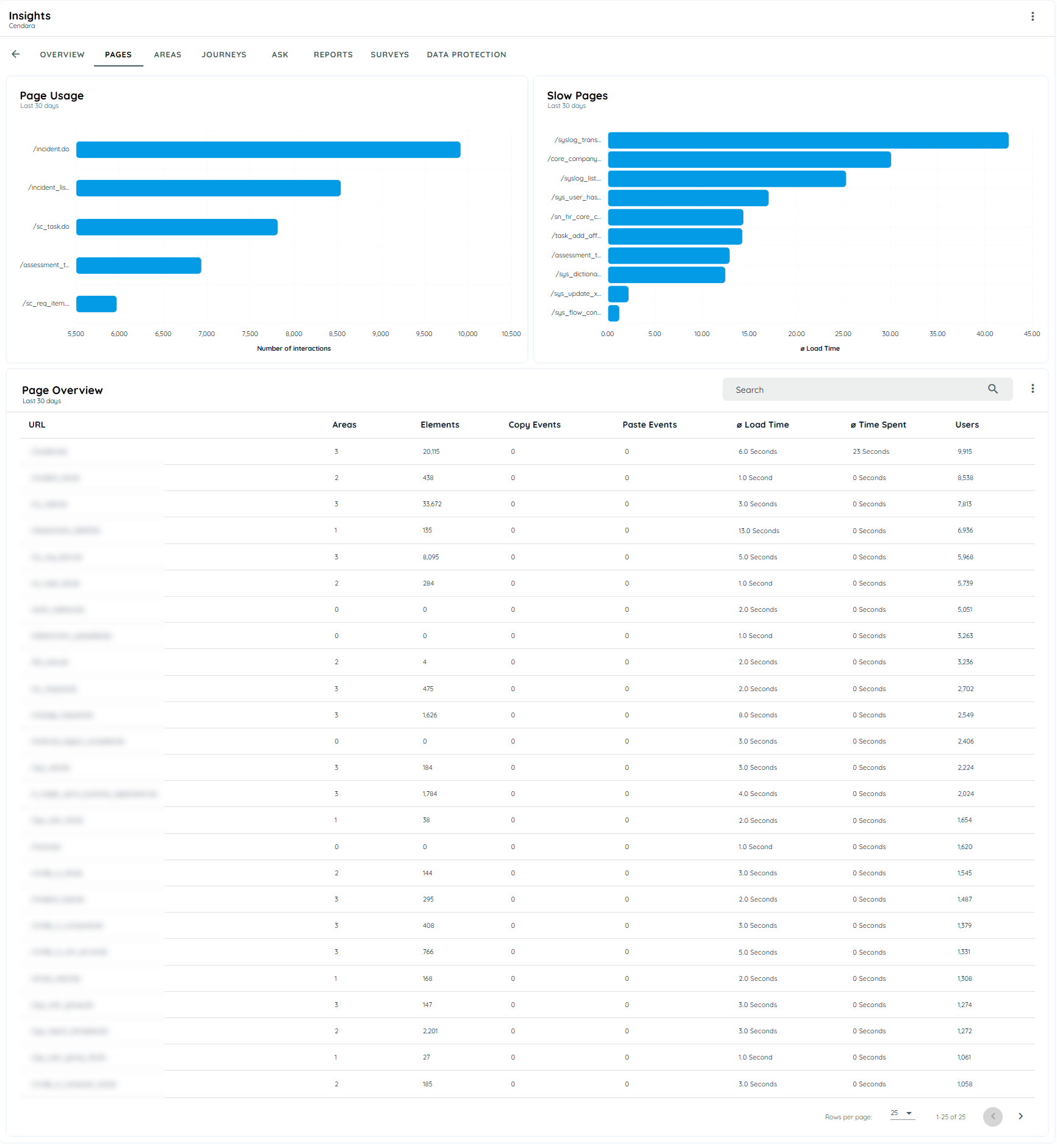 The Pages tab displays all the page usage and slow pages of each URL accessed by the users using AppNavi. It also displays a section of page overview which represents all the URLS that have interactions and this table displays all URL's, areas, elements, copy counts, paste counts, load time, time spent and users.