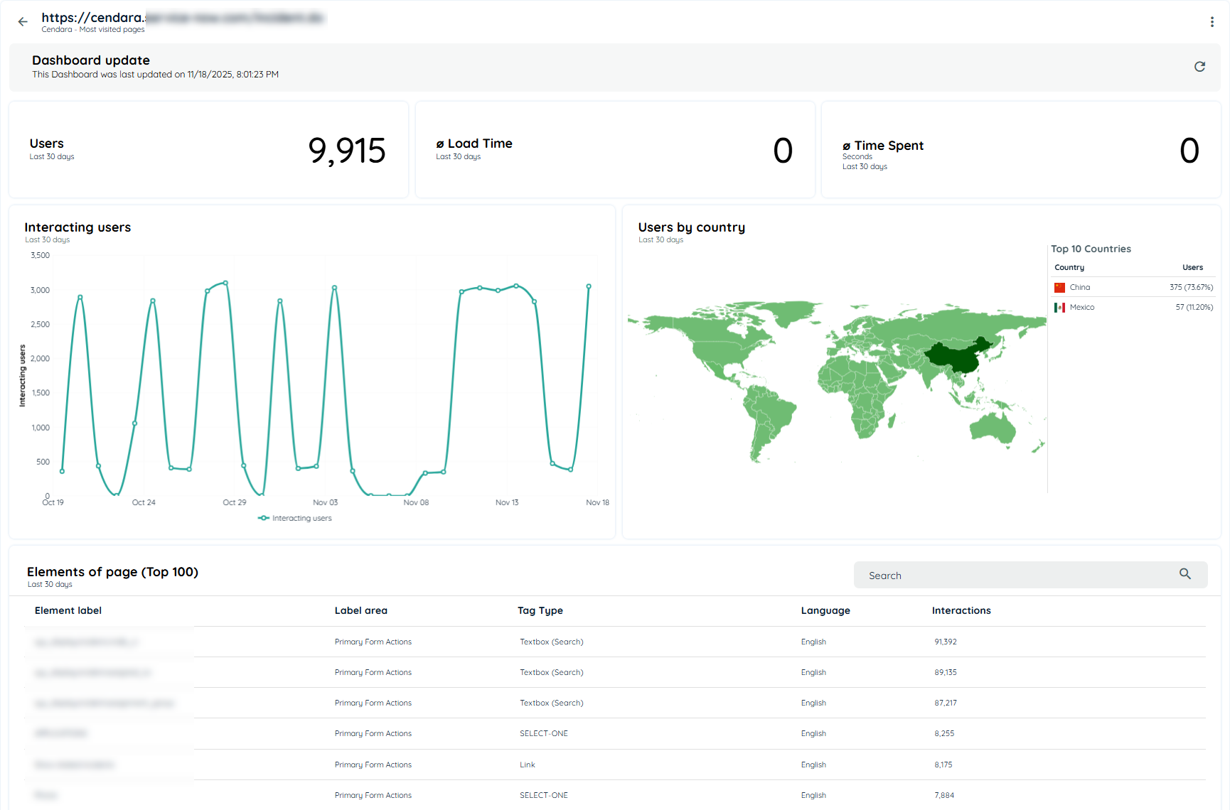The detailed analytics page displays the number of users interacted on that URL, load time of that URL, time spent on that URL, country from the users have interacted. It also displays top 100 element labels along with its area label, tag type, language and number of interactions.