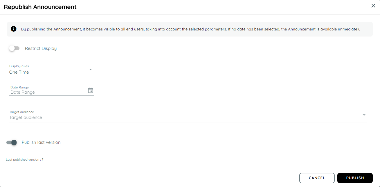 For announcement user can manage its occurrence on client side, means if user want announcement to appear frequently he may set a rule for daily announcement. There are three rules that user can set: