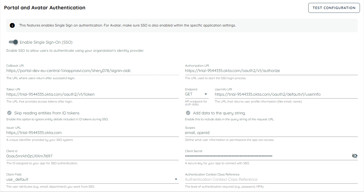 - Define which user attributes to fetch from SSO and authentication level required (password, MFA, etc.).