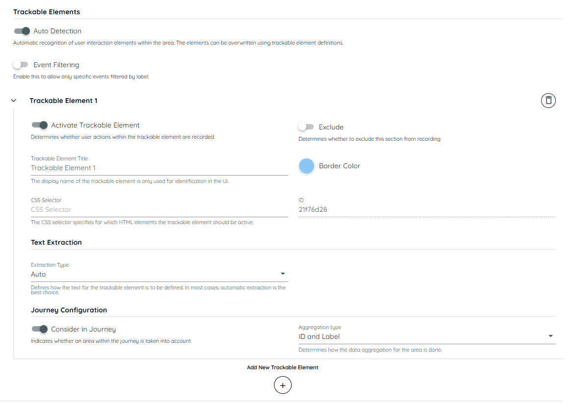 Within each defined area, users can set up multiple Trackable Elements to monitor finer details of user interactions. Each element has unique configuration options to control its tracking behavior: