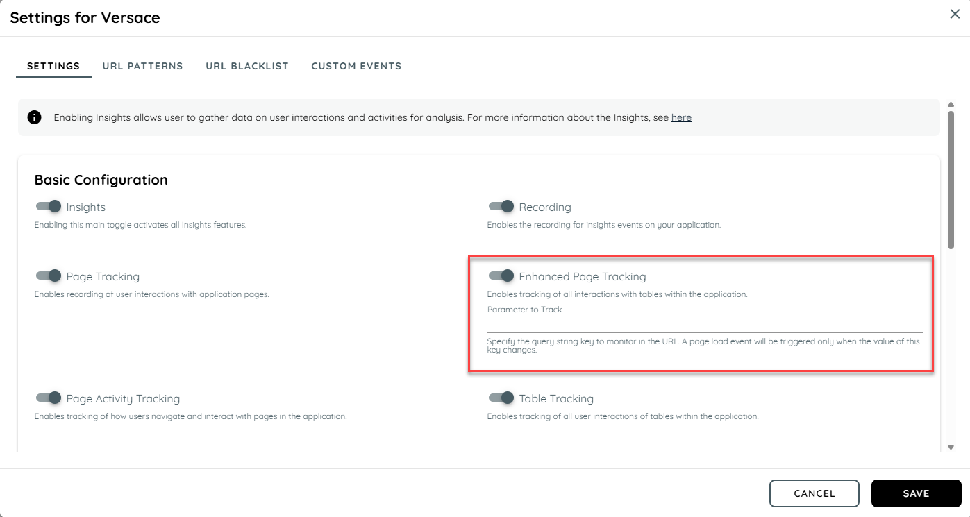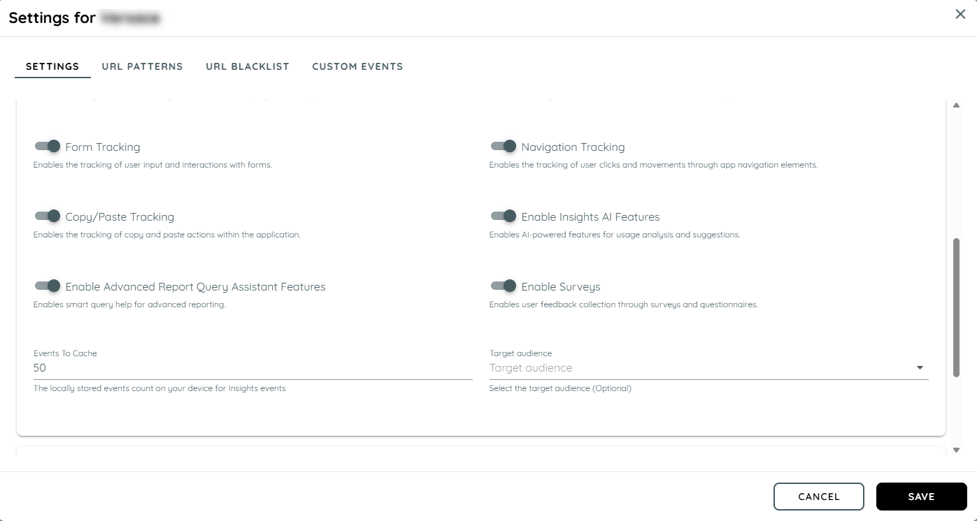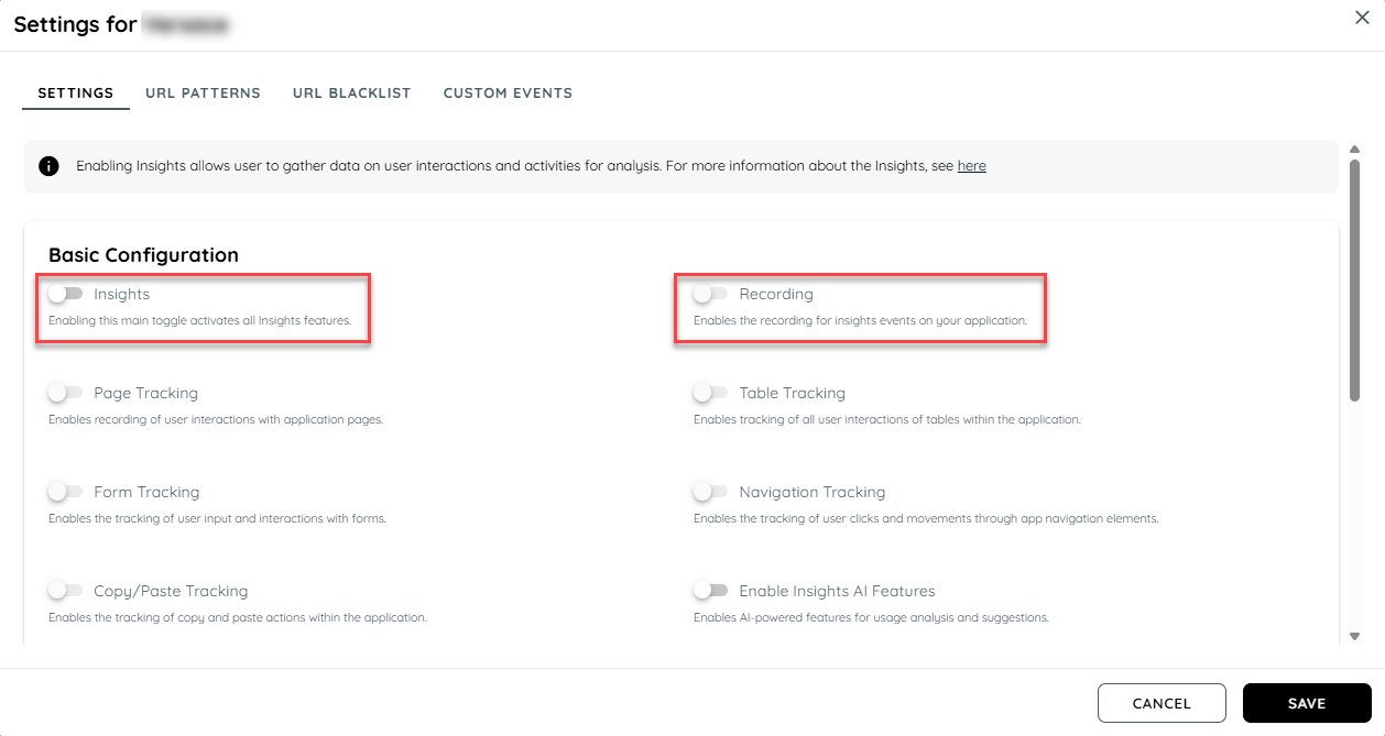 Insights: Activates the Insights feature for this application, allowing interaction tracking based on selected settings.