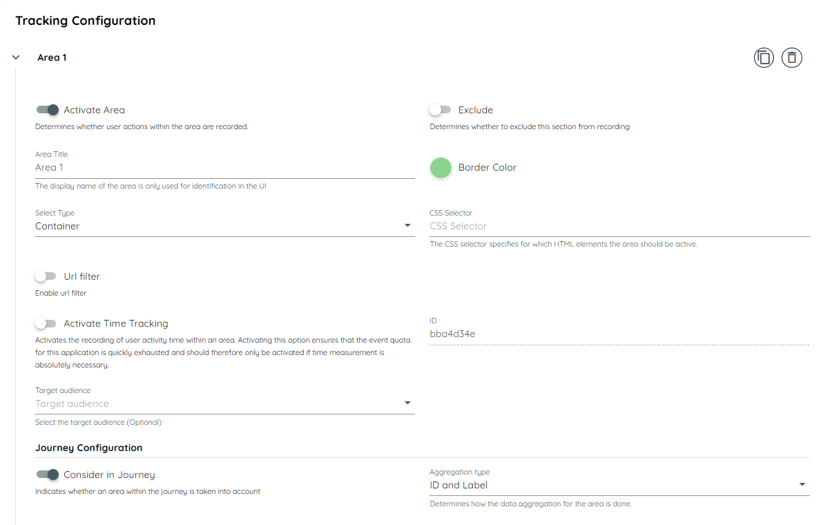 The Tracking Configuration section provides detailed settings for managing areas and specific trackable elements within an application: