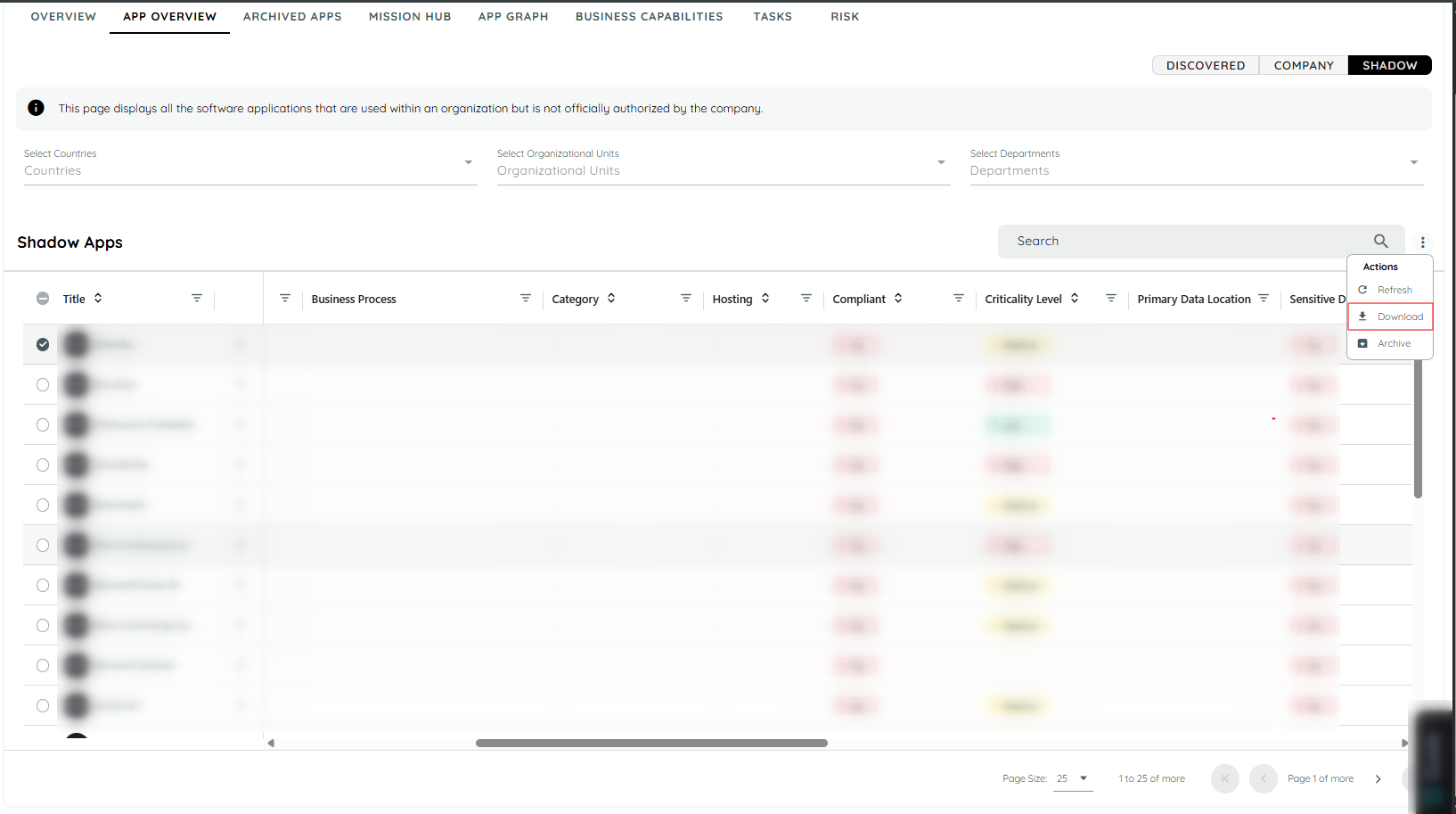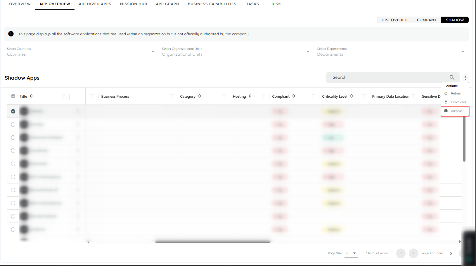 Archived apps are removed from the Shadow and Discovered Apps lists. Their data is excluded from visualizations after the nightly system update.