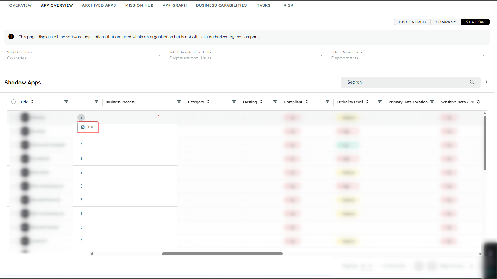 Each row in the table represents a discovered shadow app. The following columns are displayed: